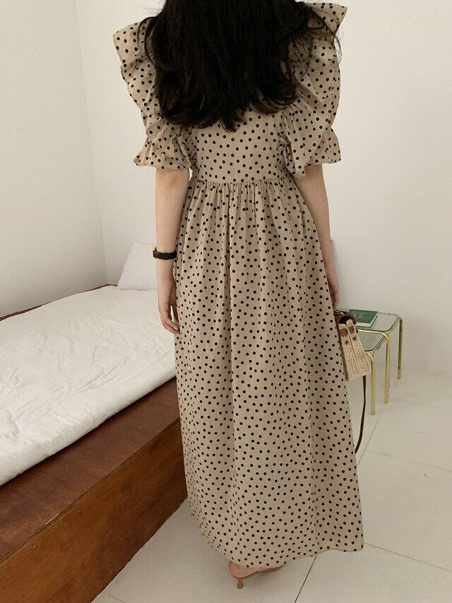 ドット柄が上品でフェミニンなロング丈ワンピース。