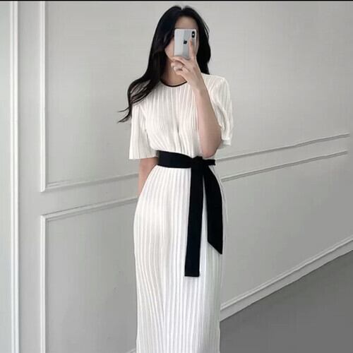 プリーツ ロング丈 ワンピース ベルト 清楚 エレガント 上品 大人 カジュアル キレイめ お出かけ お買い物 デート 女子会 通勤 通学 学生 韓国ファッション 春 夏