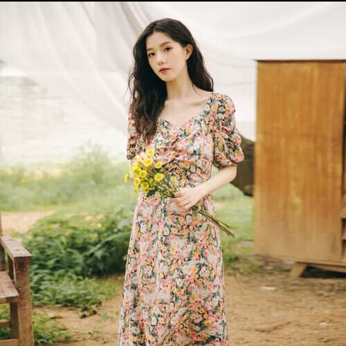 半袖 花柄 フローラル フェアリー ワンピース ロング丈 大人 カジュアル 可愛い キレイめ 上品 お出かけ お買い物 デート 女子会 通勤 通学 学生 韓国ファッション 春 夏