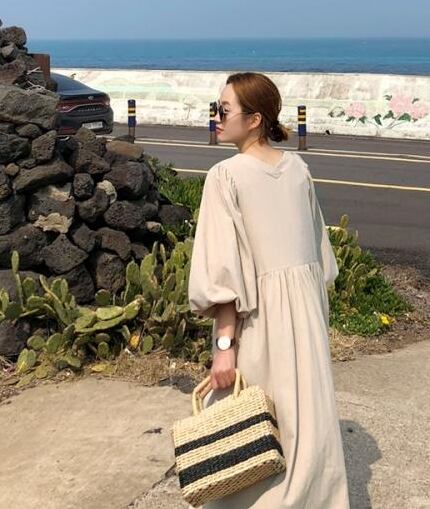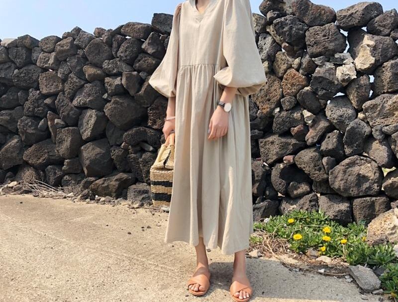 全2色 ワンピース リネン 麻 ゆったり オーバーサイズ ビッグシルエット パフスリーブ Vネック ナチュラル ロング丈 フレア 7分袖 大人 カジュアル デイリー シンプル レトロ 春 夏
