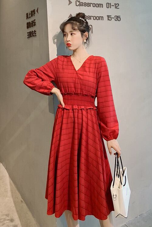 レトロワンピース レッド ハイウエスト ギャザー 長袖 パフスリーブ カシュクールワンピース ドレス ひざ丈 華やか 大人カジュアル 秋 冬 デート お出かけ 韓国 オルチャン