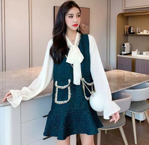ツーピース ワンピース セットアップ ボウタイ ブラウス ミニ丈 フリルワンピ 秋冬 ビショップ袖 デート 装飾 華やか
