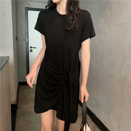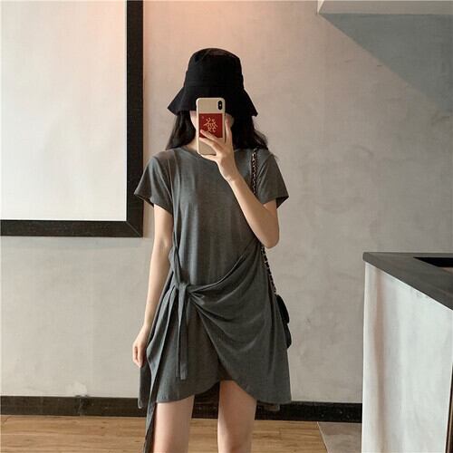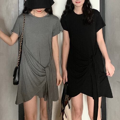 全2色 ワンピース ミニワンピース Tシャツ ラウンドネック 半袖 シンプル ゆったり カジュアル リゾート デイリー 普段着 夏 グレー ブラック