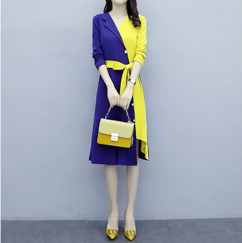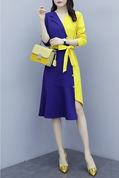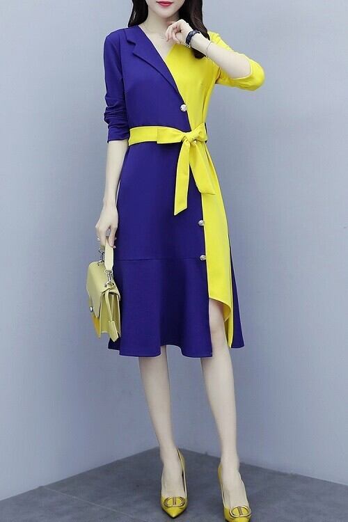 鮮やかな配色が目を引く上品なミディ丈ワンピース。