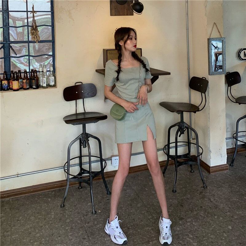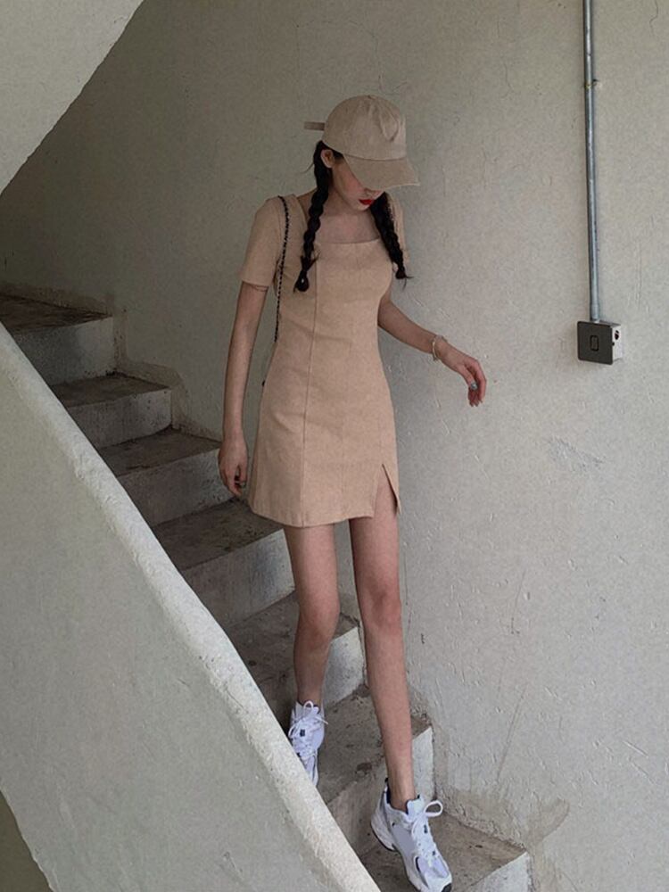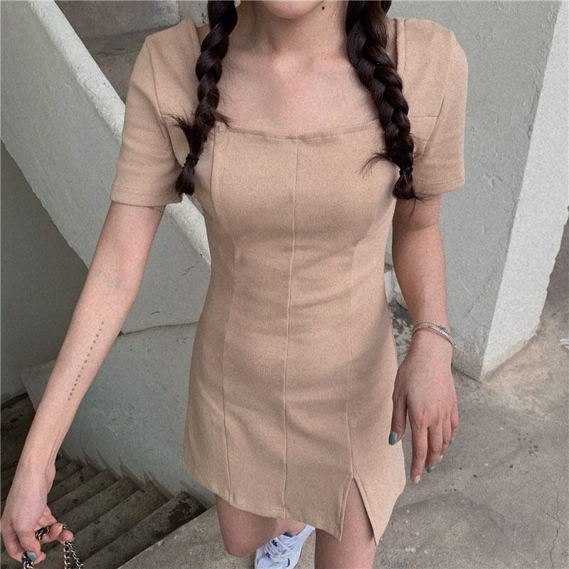 全4色 ワンピース ミニ丈 スリム スクエアネック サイドスリット 半袖 タイト 可愛い セクシー ガーリー 無地 リゾート カジュアル レトロ デート 春 夏