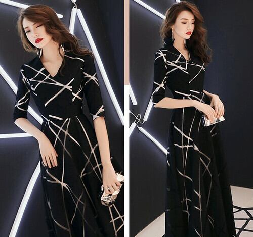 マキシ丈ワンピース ロングドレス ブラック Vネック 5分袖 エレガント 上品 大人セクシー カジュアルパーティ お呼ばれ 女子会 秋 冬 韓国