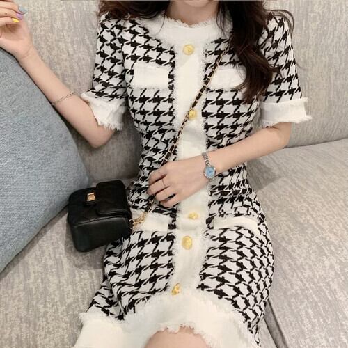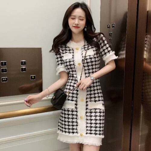 千鳥格子柄 ボタン タイト ワンピース スリム ラウンドネック 大人 可愛い キレイめ エレガント お呼ばれ パーティー お出かけ お買い物 デート 女子会 通勤 通学 学生 秋 冬