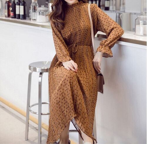 シフォンの柔らかな素材が揺れるロング丈のプリーツワンピース。