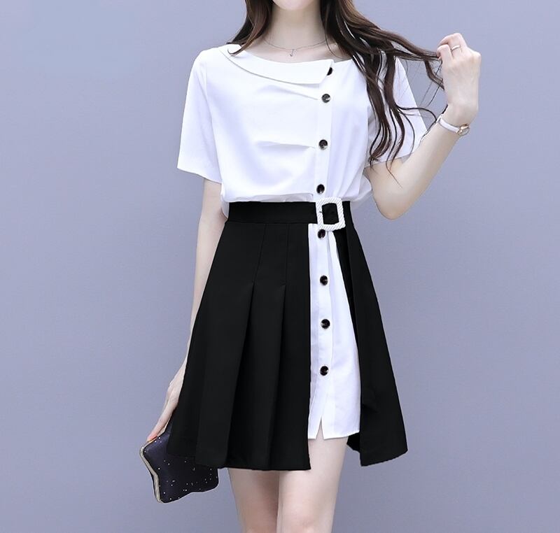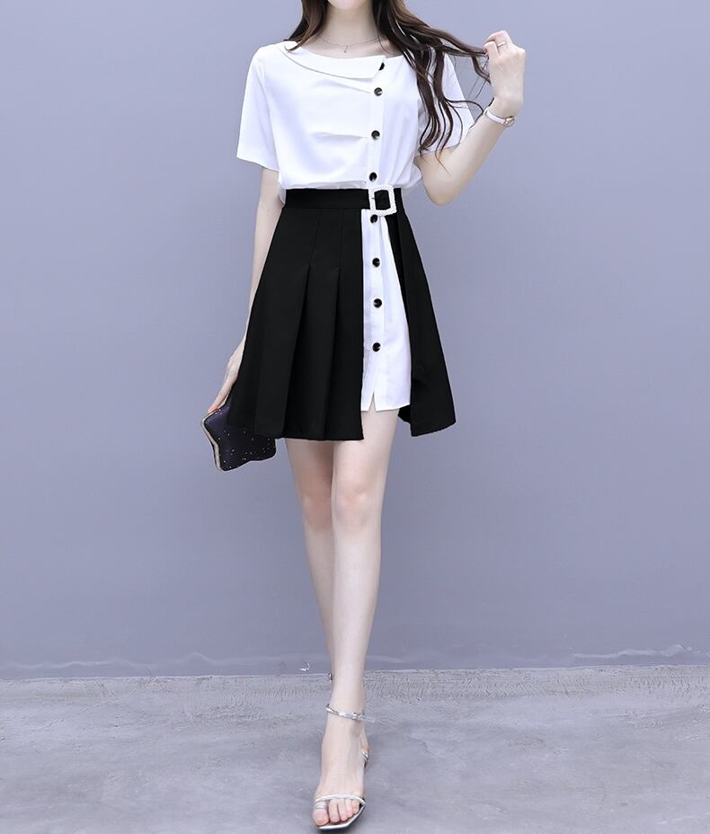 全2色 セットアップ ツーピース ワンピース シャツ ラップスカート ボタン プリーツ ミニ丈 半袖 ハイウエスト バイカラー カジュアル 上品 きれいめ デート 春 夏