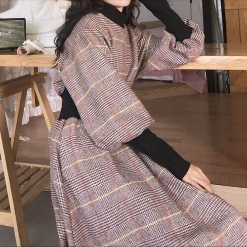 全2色 ワンピース ミモレ丈 ひざ下丈 長袖 ハイネック パフスリーブ レトロ チェック ヴィンテージ カジュアル ゆったり 体型カバー 大人可愛い 秋冬 お出かけ 通学 通勤 ブラック ブラウン