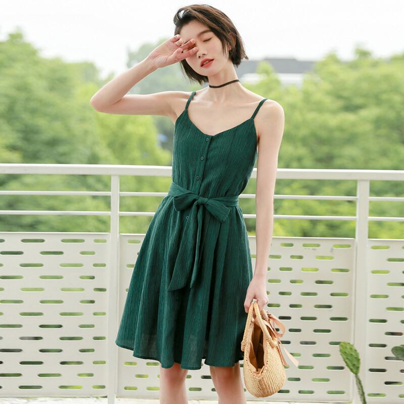 ワンピース ショート丈 キャミソールワンピ ウエストリボン フロントボタン フレア カジュアル 無地 リゾート デート 大人可愛い デイリー お出かけ レトロ 夏