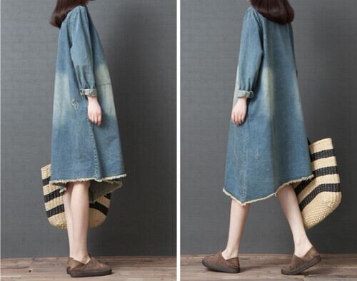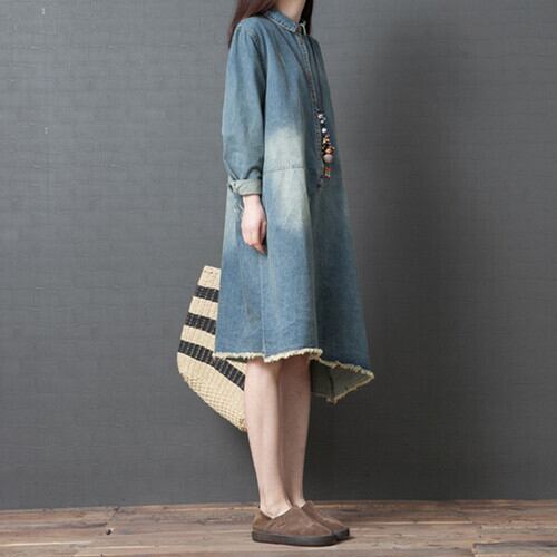 大きいサイズ ワンピース デニムワンピース シャツワンピース 切りっぱなし 長袖 ゆったり 秋冬 春 カジュアル レジャー 通学 お出かけ 普段着 ブルー