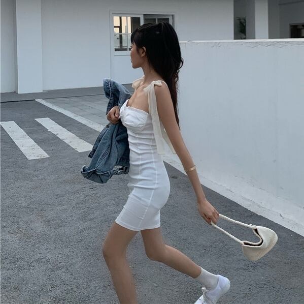 全2色 ワンピース ミニ丈 タイト リボン スクエアネック スリム セクシー 無地 カジュアル きれいめ 可愛い キャバドレス ナイト 春 夏