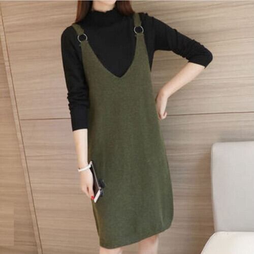 全4色 ワンピース ジャンパースカート ひざ丈 Iライン リング 無地 ゆったり 体型カバー きれいめ カジュアル お出かけ 秋冬 ブラウン ワインレッド グリーン グレー