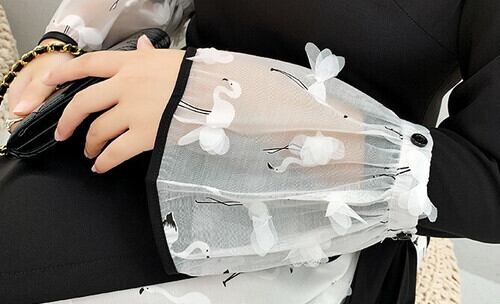 ウエスト位置から裾に向かって白鳥柄の生地が組み込まれ