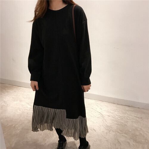 全2色 ロングドレス ワンピース プリーツ フリル ブラック グリーン 長袖 ドロップショルダー スウェット 大人カジュアル 韓国 オルチャン