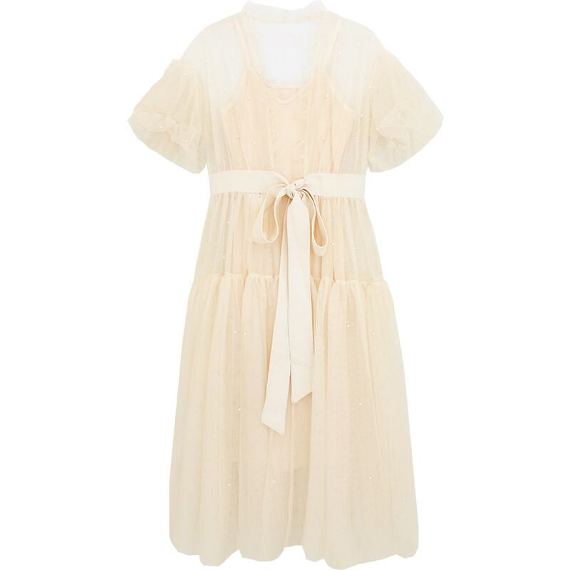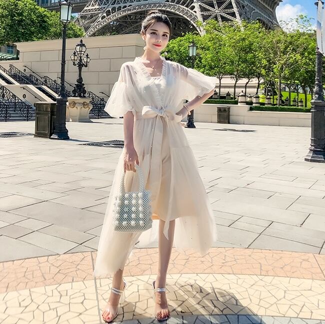 セットアップ ツーピース キャミソールワンピ ワンピース パール カーディガン ひざ丈 ロング丈 シフォン フレアスリーブ 5分袖 ガーリー カジュアル きれいめ 可愛い シースルー ウエストリボン チュール 夏