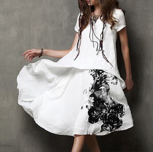 ワンピース ミディ丈 コットンリネン Vネック 半袖 レイヤード ゆったり 体型カバー カジュアル フェミニン お出かけ デイリー リゾート デート 女子会 夏 ホワイト