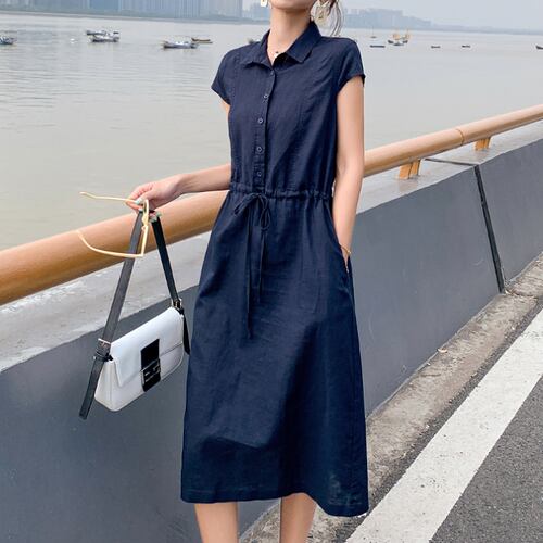 全2色 麻綿リネンコットン ワンピース ひざ丈 ミディ丈 大きいサイズ 襟付き 半袖 ウエストリボン シンプル ハイウエスト カジュアル お出かけ リゾート デート デイリー 普段着 夏 ネイビー カーキ