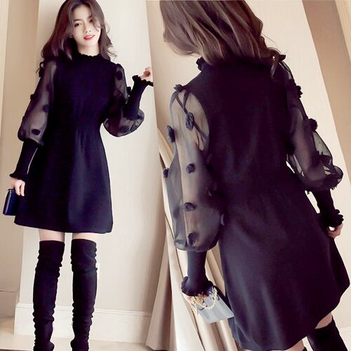 ニットドレス ワンピース ブラック ミニ丈 ドット シースルー ハイネック ハイウエスト 長袖 大人可愛い カジュアルパーティ 秋 冬 韓国 オルチャン