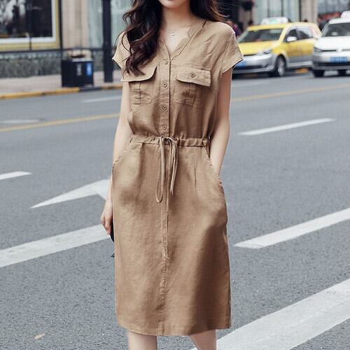 全2色 ワンピース 麻綿リネンコットン ひざ丈 ミディ丈 大きいサイズ Vネック 半袖 シンプル ゆったり 体型カバー カジュアル お出かけ リゾート デート デイリー 普段着 夏 ネイビー カーキ