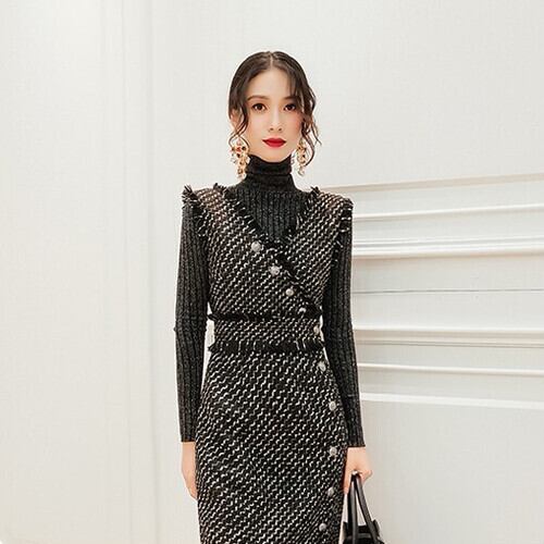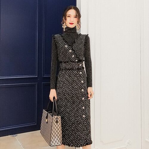ツイード ジャンパースカート ワンピース ドレス サイドボタン ノースリーブ ひざ丈 タイト ブラック 上品 エレガント 大人きれい 韓国 オルチャン 秋 冬