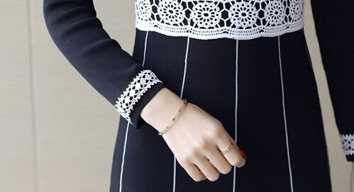 ニットワンピース ニットドレス ブラック Vネック ハイウエスト レース ひざ丈 長袖 上品 エレガント 大人きれい 韓国 オルチャン お呼ばれ フェミニン