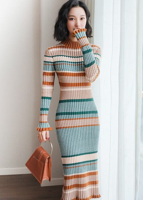マルチボーダーでスタイリッシュなニットワンピース♪