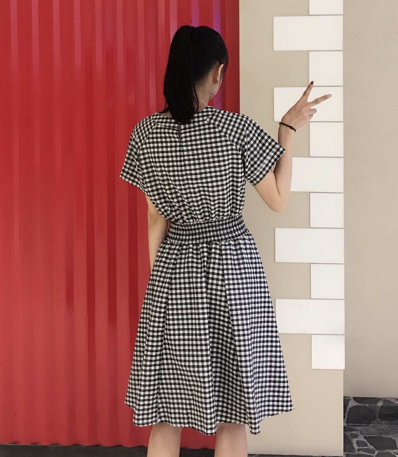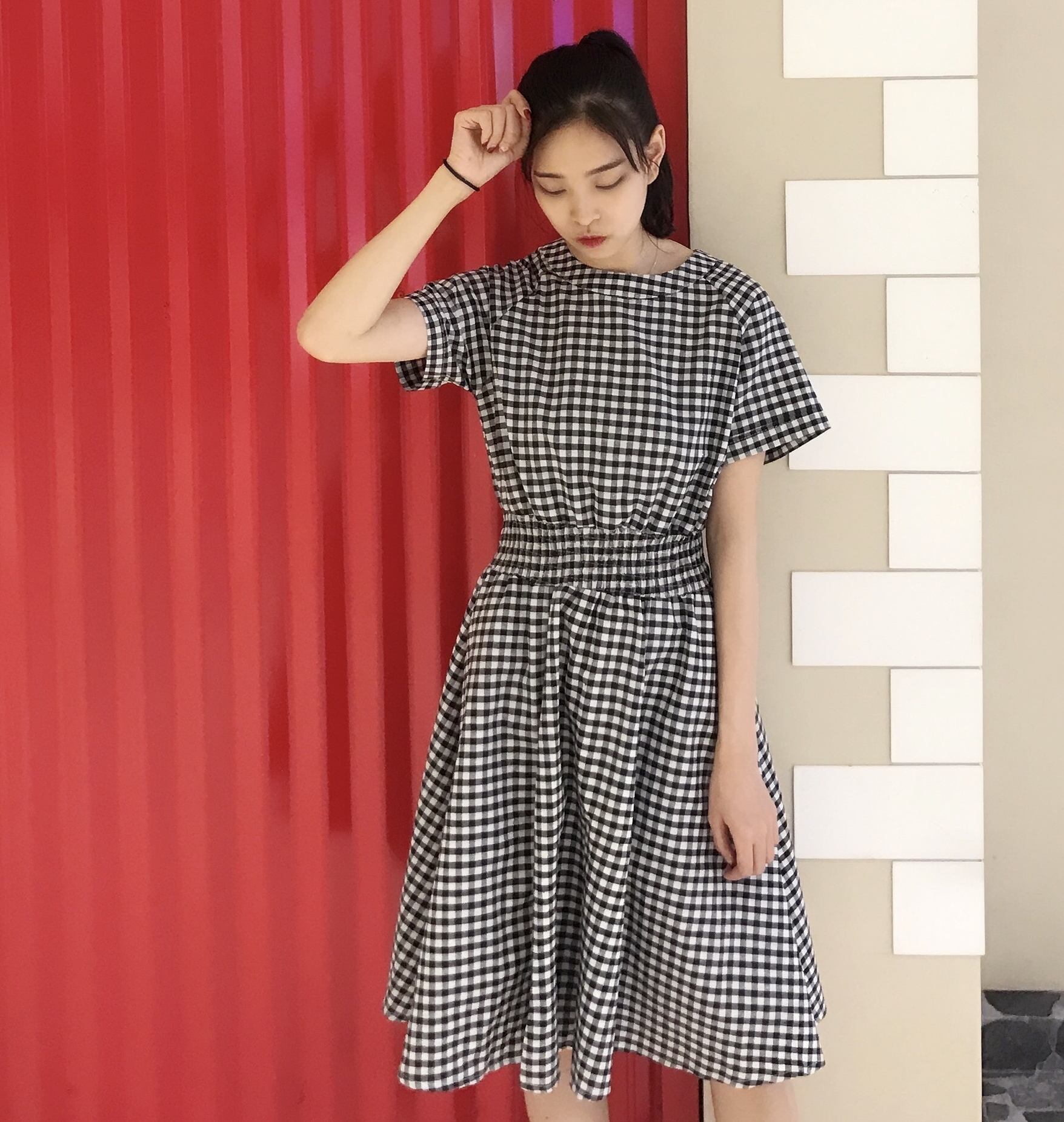 全2色 ワンピース リネン コットン 綿 麻 ラウンドネック ハイウエスト チェック柄 半袖 ひざ丈 大人 カジュアル お出かけ リゾート デート フレア 夏