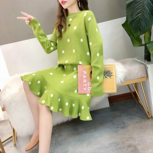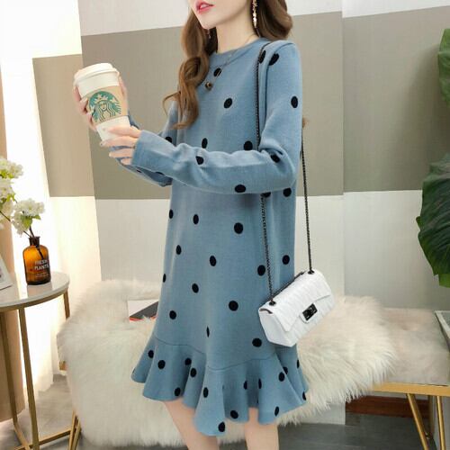 全2色 ニットワンピース ワンピース マタニティ ラウンドネック 長袖 水玉柄 ドット柄 レトロ ガーリー かわいい カジュアル お出かけ デート オフィス デイリー 普段着 秋冬 グリーン ブルー ベージュ ブラック