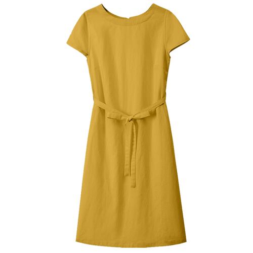 全4色 大きいサイズ 小さいサイズ ワンピース ひざ丈 ラウンドネック 麻綿リネンコットン 半袖 フレンチスリーブ シンプル レトロ きれいめ 清楚 可愛い カジュアル お出かけ デート リゾート 夏 ベージュ ネイビー イエロー グリーン