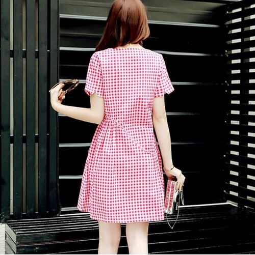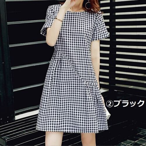 ギンガムチェックが可愛いひざ丈ワンピース。