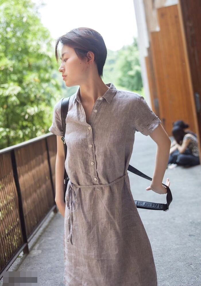 全3色 ワンピース シャツワンピース 麻 綿 リネン コットン 襟 ひざ丈 Vネック フロントボタン 大人 上品 フレア ウエストリボン 半袖 お出かけ カジュアル デイリー シンプル 夏