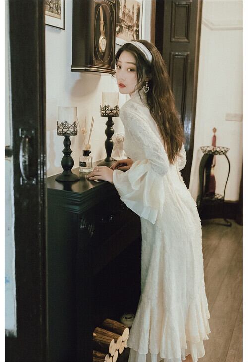 ドレス 刺繍 レース フレア袖 長袖 ミモレ丈 ワンピース スカート Aライン パーティードレス ハイネック 秋冬 お出かけ 二次会 デート 謝恩会 発表会 フォーマル エレガント フェミニン 大人可愛い きれいめ ドレスワンピ