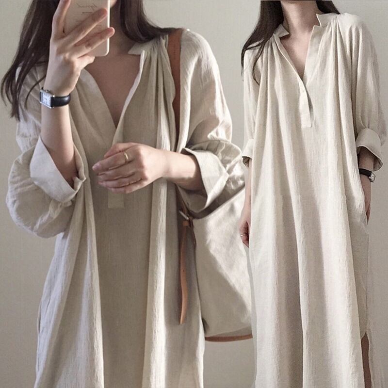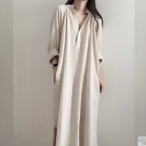 ワンピース シャツワンピース 麻 リネン コットン 綿 ロング丈 7分袖 パフスリーブ Vネック シンプル オーバーサイズ サイドスリット カジュアル 大人 デイリー ラフ リラックス スタンドカラー ナチュラル 無地 夏