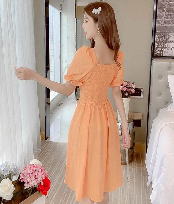 全2色 ワンピース リネン 麻 コットン 綿 ひざ丈 スクエアネック フロントボタン ウエストシャーリング 半袖 パフスリーブ フレア 上品 カジュアル 大人可愛い お出かけ きれいめ デート リゾート 夏