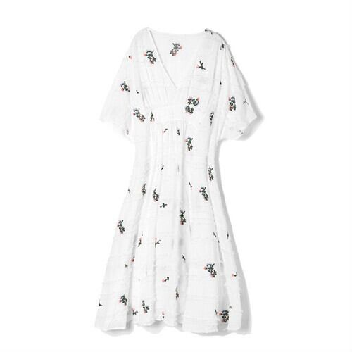 大きいサイズ ワンピース Aライン フレアスカート 麻綿リネンコットン ひざ丈 ミディ丈 Vネック フレアスリーブ 半袖 シンプル 花柄 きれいめ レトロ ゆったり カジュアル マタニティ お出かけ デート リゾート デイリー 普段着 夏 ホワイト