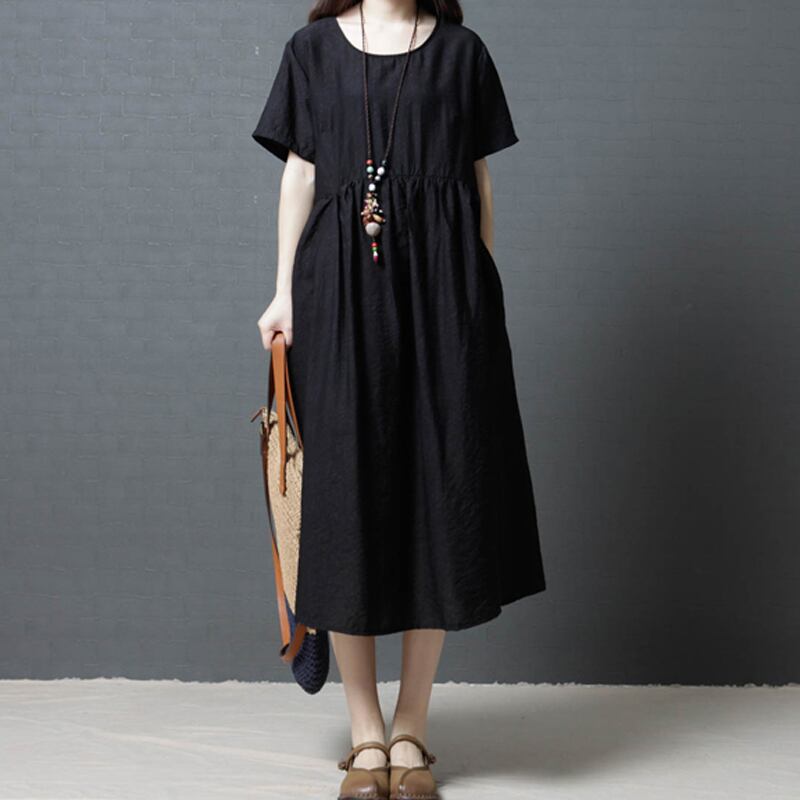 全3色 ワンピース 麻 綿 リネン コットン ミモレ丈 フレア オーバーサイズ ゆったり 半袖 お出かけ カジュアル 大人 デイリー シンプル 体型カバー リラックス 夏