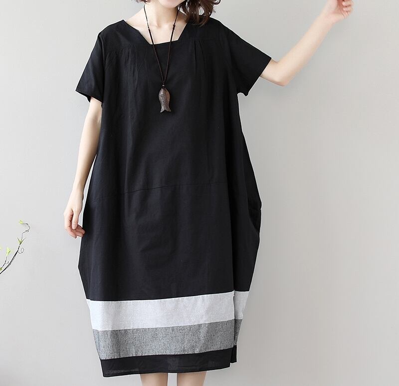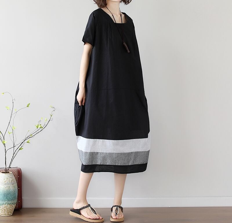 大きいサイズ ワンピース 麻 綿 リネン コットン ミモレ丈 ゆったり コクーン オーバーサイズ 半袖 お出かけ スクエアネック ボーダー カジュアル 大人 デイリー 体型カバー リラックス 夏