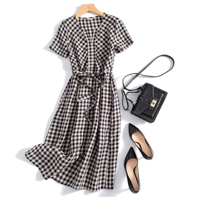 ワンピース チェック柄 麻 綿 リネン コットン ミモレ丈 Vネック 大人 フレア ウエストリボン 半袖 お出かけ カジュアル デイリー シンプル レトロ 夏