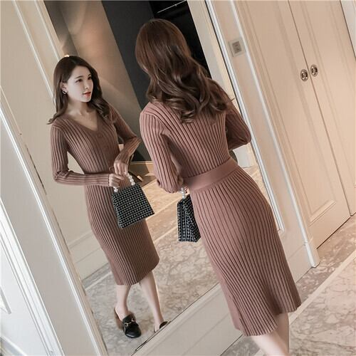 全3色 リブニットワンピース フロントボタン Vネック 長袖 ブラウン ベージュ ブラック 秋 冬 フィット スリム 大人きれい 大人セクシー 上品 エレガント 韓国 オルチャン