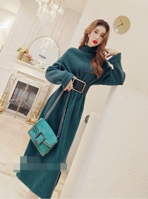 全2色 ニットワンピ 長袖 ハイネック リブニット ワンピース ベルト付き ミモレ丈 ひざ下丈 ゆったり 秋冬 カジュアル お出かけ デート 女子会 大人可愛い フェミニン ガーリー こなれ感 レトロ Iライン ざっくり 無地