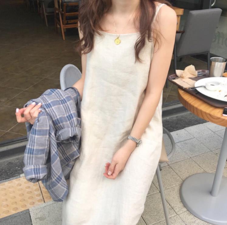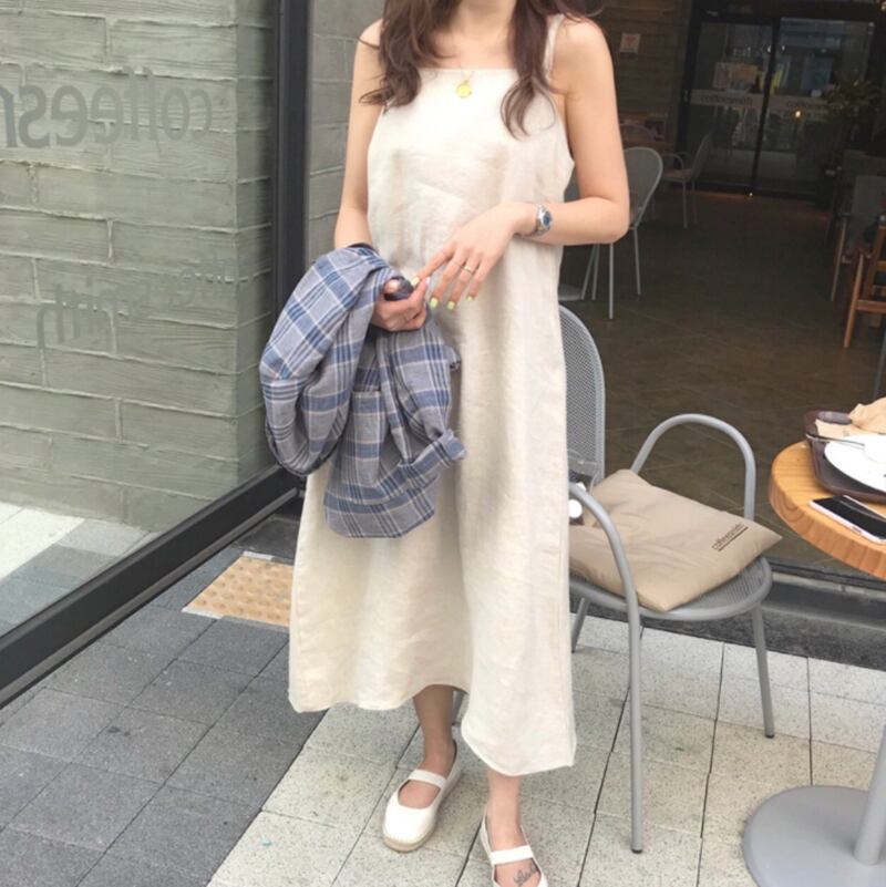 全2色 ワンピース キャミソールワンピ リネン 麻 コットン 綿 ミモレ丈 シンプル 無地 ゆったり ストレート カジュアル 大人 お出かけ リゾート デイリー リラックス 韓国ファッション 夏