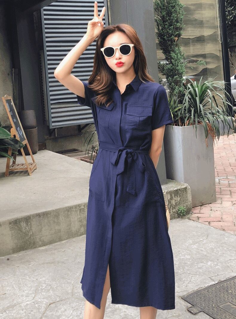 全2色 ワンピース シャツワンピース 麻 綿 リネン コットン 襟 サイドスリット ミモレ丈 Vネック フロントボタン 大人 上品 ウエストリボン きれいめ 半袖 お出かけ カジュアル デイリー シンプル 夏