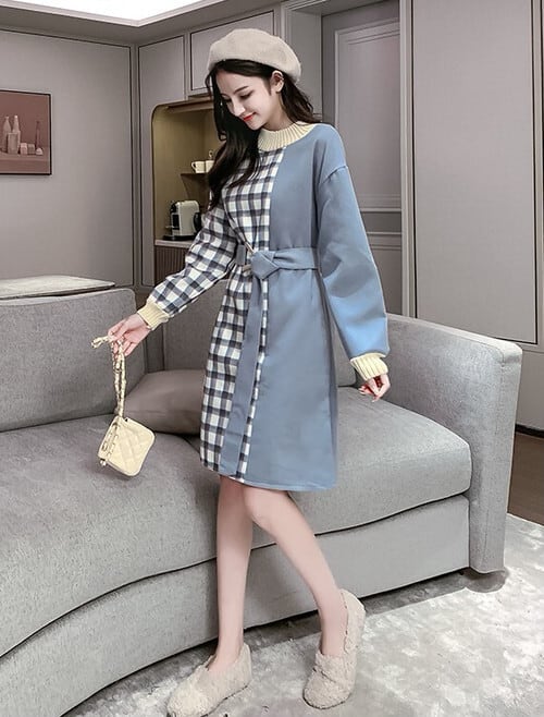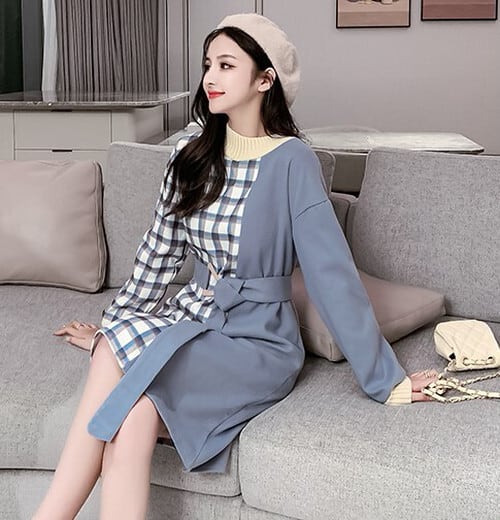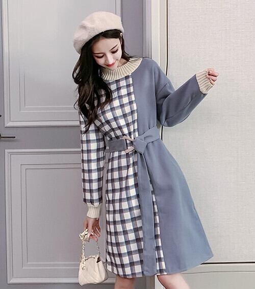 全2色 ニットワンピース ドレス チェック柄 ハイネック 長袖 バイカラー ベージュ ブルー ひざ丈 ウエストベルト 上品 エレガント 通勤 通学 オフィスカジュアル デート 韓国 オルチャン 秋 冬