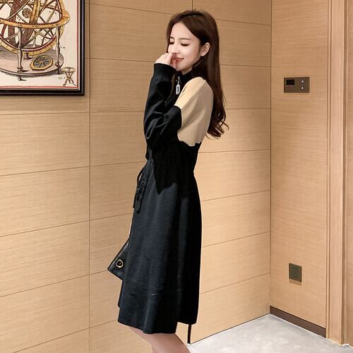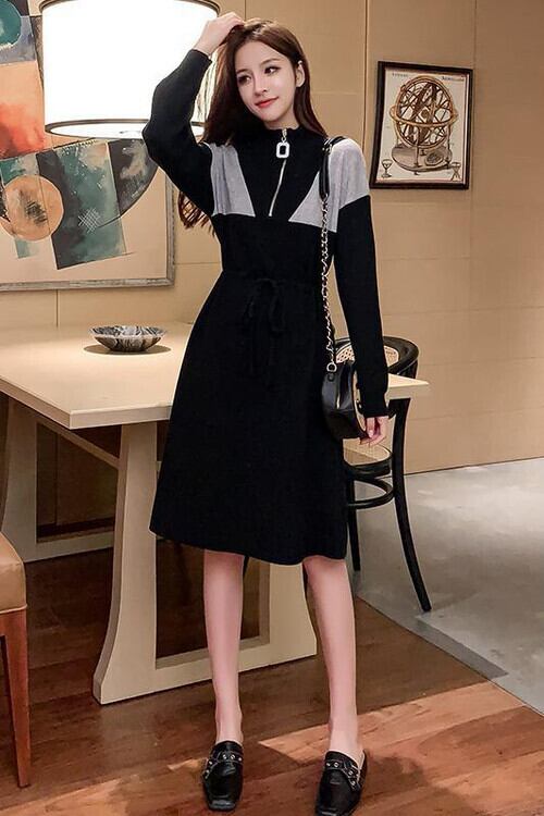 全3色 ハイネックワンピース ジッパー 長袖 ドロップショルダー ひざ丈 フレアシルエット ベージュ グリーン グレー 秋 冬 韓国 オルチャン カジュアル スポーティ ネックジッパー