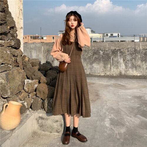 ワンピース チェック柄 ミモレ丈 ベイクドカラー ひざ下丈 プリーツ ジャンパースカート 秋冬 お出かけ デート 女子会 カジュアル きれいめ 大人可愛い フェミニン 上品 エレガント レトロ