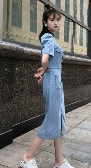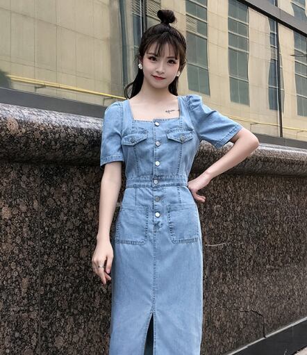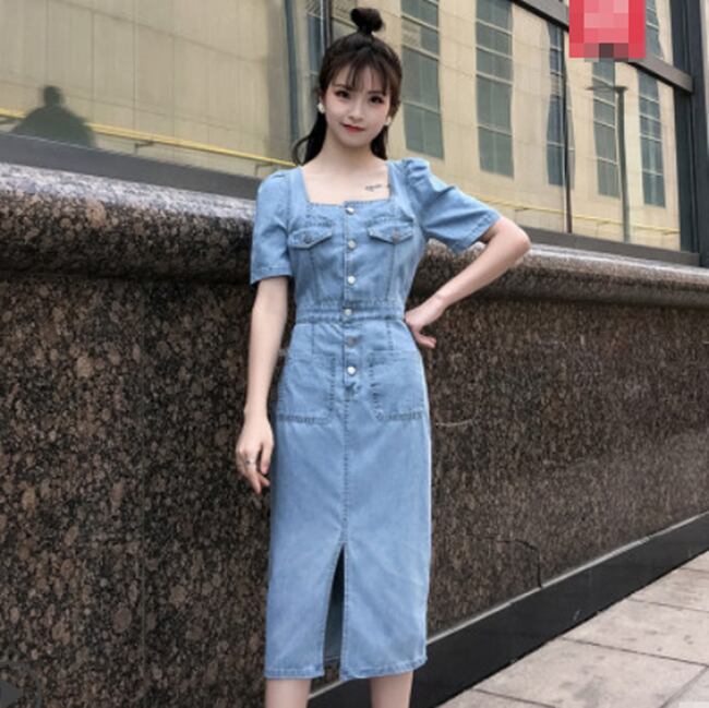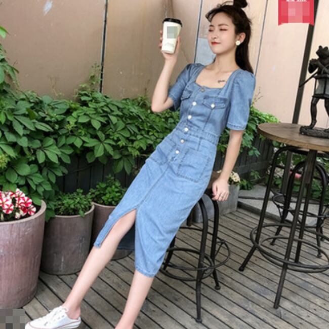 デニムワンピース フロントボタン 半袖 ミモレ丈 スリム タイト フロントスリット スクエアネック カジュアル 大人可愛い きれいめ デート レトロ ジーンズ フロントスリット 春 夏