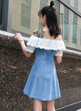 デニムワンピース フロントボタン オフショルダー 半袖 ショート丈 スリム レース カジュアル 大人可愛い きれいめ デート ジーンズ フレア 夏