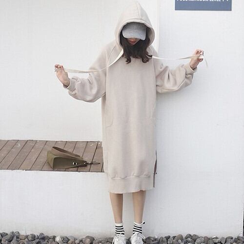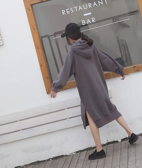 全3色 スウェットワンピース フード付き ミモレ丈 秋 冬 長袖 ラグランスリーブ 大人カジュアル 休日コーデ 韓国 オルチャン